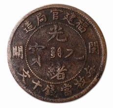 晚清时期铸有一种铜币,称为“闽关铜元”。该铜元正面中心有“光绪元宝”四字,珠圈上方署“福建官局造”,下方署“每枚当钱十文”,两侧分列“闽关”二字,表明其铸造厂为福建闽海关铜币局,故名“闽关铜元”。钱背中央有蟠龙图案,珠圈外环以英文“F—K.CUSTOM—HOUSE”(译作福建海关)、“10CASH”(十文)字样,左右两旁饰有五角花星。这是晚清时期唯一一所由海关附设的铜元局铸造的铜元。