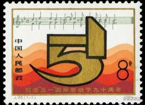 1979年发行的“纪J35《纪念‘五一’劳动节九十周年》”纪念邮票。1979年5月1日,我国发行“纪J35《纪念‘五一’劳动节九十周年》”纪念邮票,全套1枚,面值为8分。其主图为镰刀和铁锤巧妙组成的阿拉伯数字“5”和“1”;背景图案下半部为象征海洋的红色波形彩块,上半部为《国际歌》五线谱。该邮票堪称我国劳动节纪念邮票中的精品。