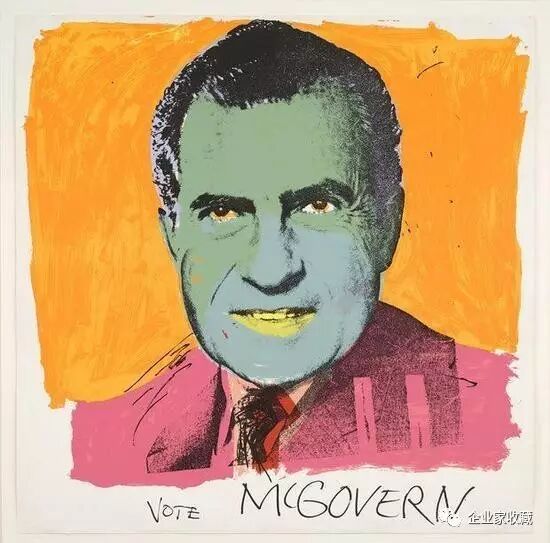 1972年沃霍尔为支持乔治·麦戈文的总统竞选,制作了其竞争对手理查德·尼克松的肖像,这张海报上的尼克松看上去乖戾、粗暴,图像下方是简单的标题:“选举麦戈文”。